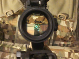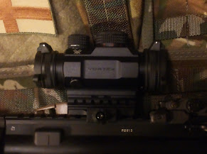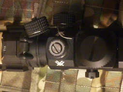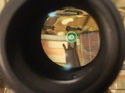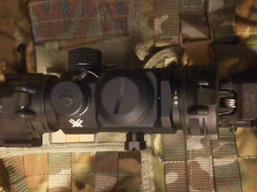 Kuten kuvasta näkyy, on Vortexin optinen laatu hinta/laatu vertailussa vähintään erinomainen. Samoin näkyy kuinka optiikan tähtäinkuvio leijuu etutähtäimen päällä, jolloin rautatähtäimiä voi käyttää ilman optiikan irrottamista, ja päinvastoin.Valoissa on valittavana punainen “päivä”- sekä vihreä “valonvahvistin”puoli. Molemmissa on viisi eri kirkkausastetta. Mutta kuten sanottu, vaikka tähtäin on pois päältä, näkyy musta etsattu kuvio lasilla. Pitänee odottaa keväthankia, että näkee onko kirkkaus riittävä, mutta uskoisin että on, juuri tuon mustan pohjan takia. Lähtökohtaisestihan juttu on niin, että tämä optiikka on tarkoitettu 0-200m välille ja se on siinä hyvä, mutta optiikka, joka sekä suurentaa riittävästi että auttaa punapistetoiminnoissa maksaa pari kertaa enemmän, semmoinenkin 1-4x kiikari Vortexilta kyllä löytyy.