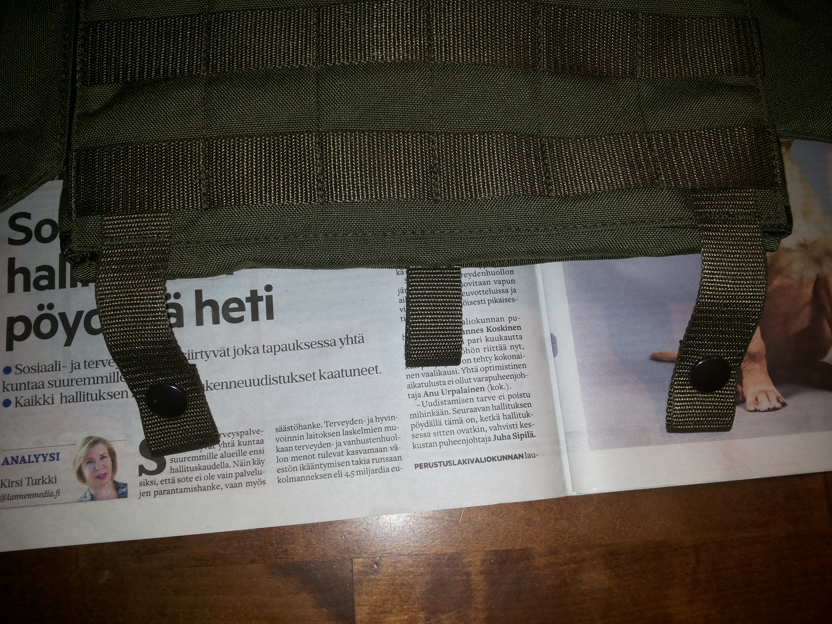 Pro Tippinä voisi miettiä, miten tuonne taakse saisi jonkinmoisen kumiköysivirityksen, niin että kiinnityksen saisi todella tiukalle, eli varusteet päälläkään ja carrieri täynnä tavaraa ei kombo liikuttaessa häiritsevästi heilu ja hölsky, vaan pysyy napakasti paikoillaan. Luulisin, että jollakin 35mm solkivirityksellä, jossa kumiköysi välissä voisi päästä pitkälle.