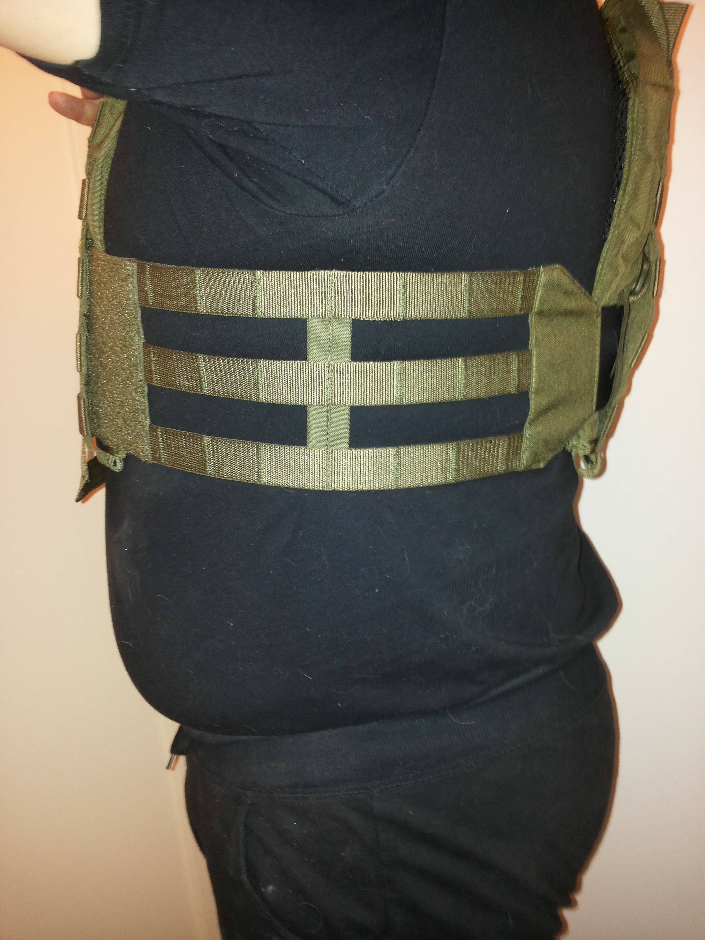 Carrierin takapaneelista löytyy sekä olkahihnojen että vyötärön säädöt, kuten edellä kuvattu. Niillä pitäisi säätää paneelit niin, että paneelin yläreuna on mahdollisimman tarkkaan soliluiden päättymispoisteen ja rintalastan yläosan kohdalla. Tällöin suojalevy suojelee kehon elintärkeimpiä osia, sydäntä, aorttaa ja keuhkoja, mahdollisimman tarkasti. Edelleen miehekkääm.. mahakkaammalla taistelijalla, kuten minulla, istuttaessa pötsi ei aja koko carrieria kurkkuun asti.