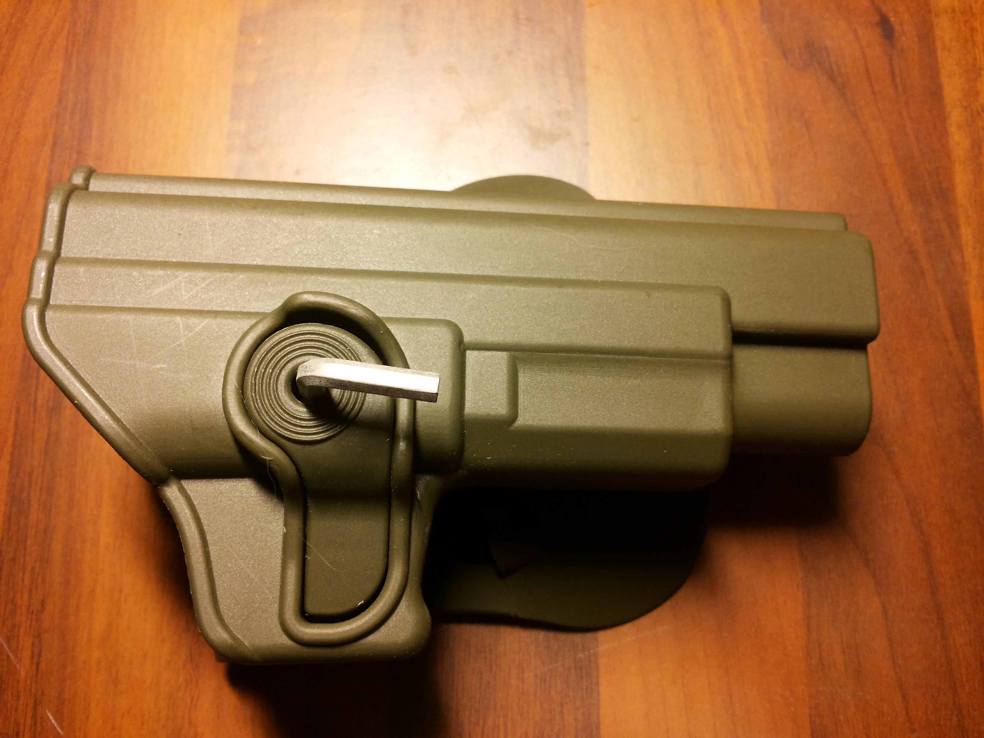 IMI retentio-kotelo on aika tavallinen kovamuovinen kotelo paddle vyökiinnityksellä. Väreinä on militaryskaalan kaikki asteet, eli kojootti, oliivi ja musta. Itselleni valikoitui juurikin tuo vihreä. Retentio sana on “amerikkaa” ja tarkoittanee käytännössä samaa kuin suomenkielen sana “varmistettu” tai “lukittu” tai ehkäpä “turva”. Otso Vainion erinomainen “Käytännön ampumataito” teos taitaa käyttää muistini mukaan ilmaisua “turvakotelo”. Kuitenkin nämä kaikki tarkoittavat käytännössä sitä, että ase lukkiutuu kiinni koteloon kun ase koteloidaan. Yleensä kotelossa on kynsi, joka tarttuu aseen liipasinkaaren sisäpuolelle, ja estää aseen vedon, tai putoamisen, ellei vapautinvipua ole samalla painettu alas.