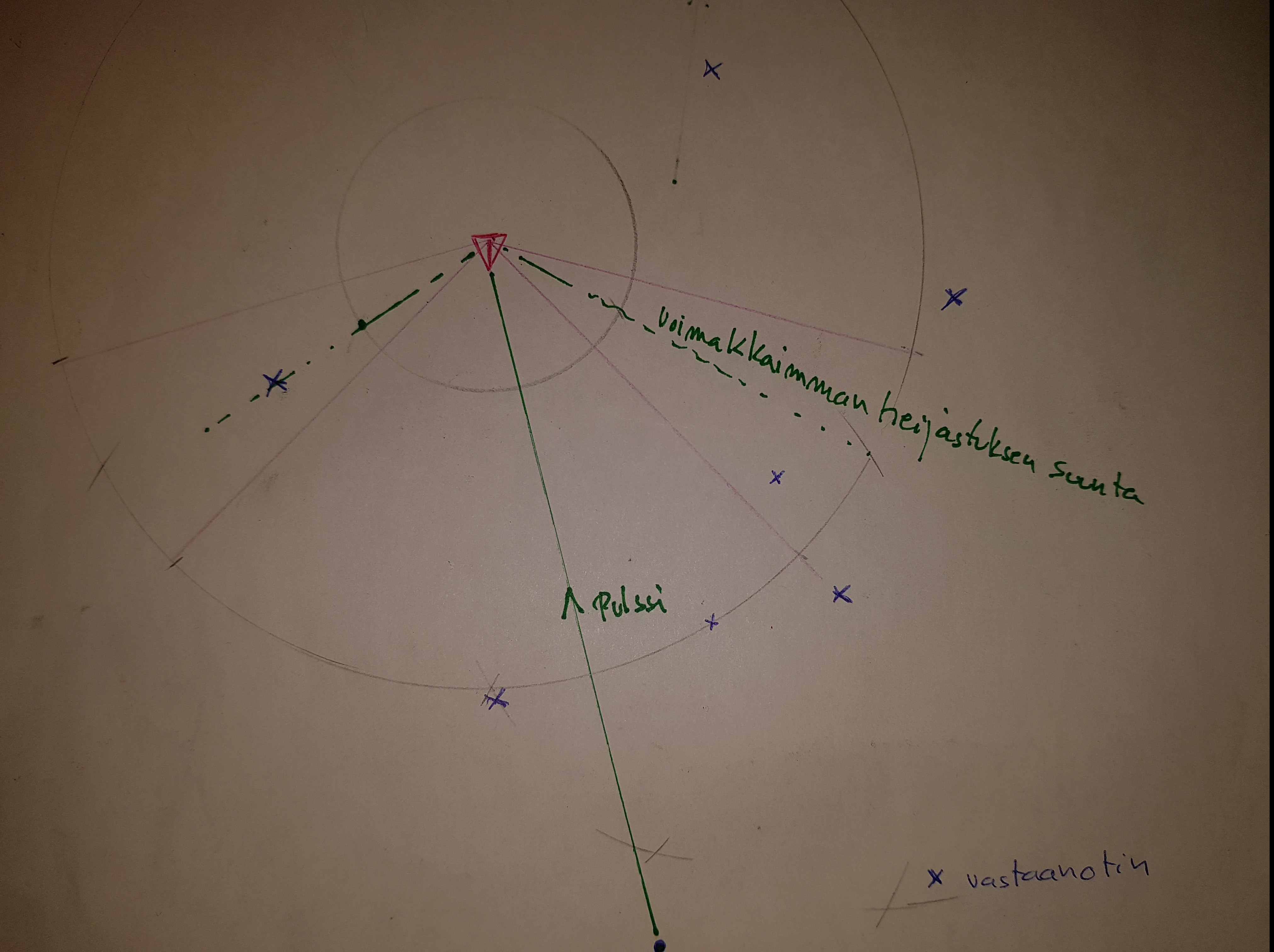 Rastit vastaanottimia, sisempi ympyrä on matka jonka sisällä kone (punainen kolmio) väistämättä paljastuu. vihreät viivat pulssin suuntia.