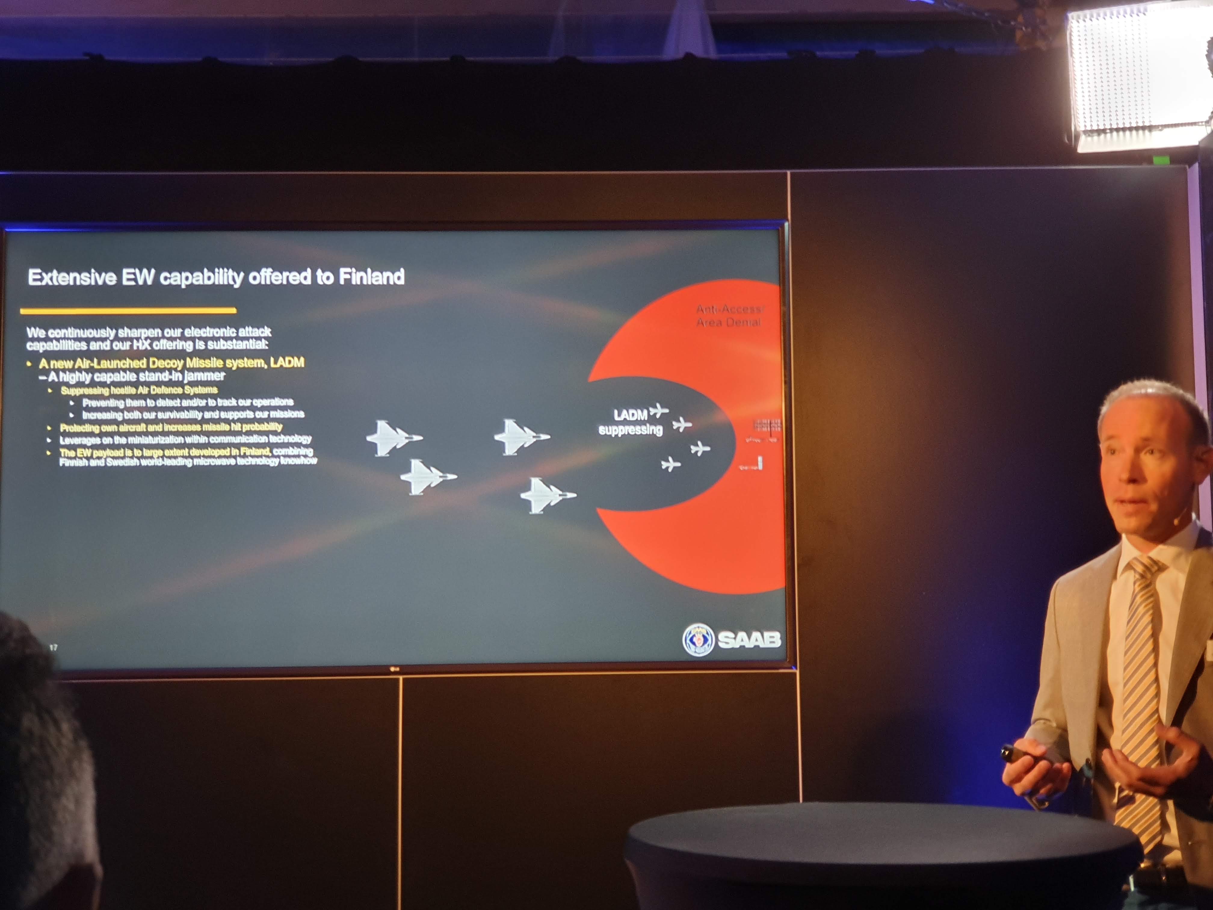 SAAB was also responssible of maybe the biggest news splash of the Kauhava 2020 airfair: They announced their decoy/jammer UAV (sort of a missile, sort of a drone, but EW/Jammer as a payload) After this addition to cababilities, Gripen E should be at par or better with all the other HX-contenders. Do not get me wrong: JAS-39 Gripen E is a great fighter! But it was lacking in capability to jam enemy radars without being itself in the harms way. AREXIS EW/jammer pods are a great system, but they were carried by the plane, so at very least home-on-jamming missiles would be a serious threat to jamming Gripens.