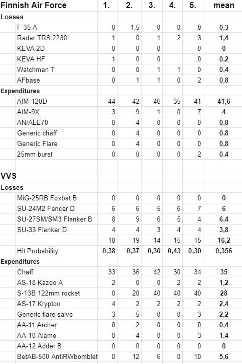 As you can see from the scorecard, F-35 As have to quite often resort into AIM-9X WVR missiles. That in itself is not bad: they will get the job done just as well, but the problem is that there were not enough AMRAAMS to take care of all the targets that came within the striking distance. This leads to more losses on FAF side. VVS had a quite of easy task of taking down Rangemaster and other radar sites. Also they got to try taking down runways. Rovaniemi was gotten to three times and Oulu once. Fortunately bases kept working just fine. (I suspect that Command Modern Warfare is not configured really well for dispersed basing). So in this scenario lack of speed and missiles transferred to more losses in Radar and basing department.