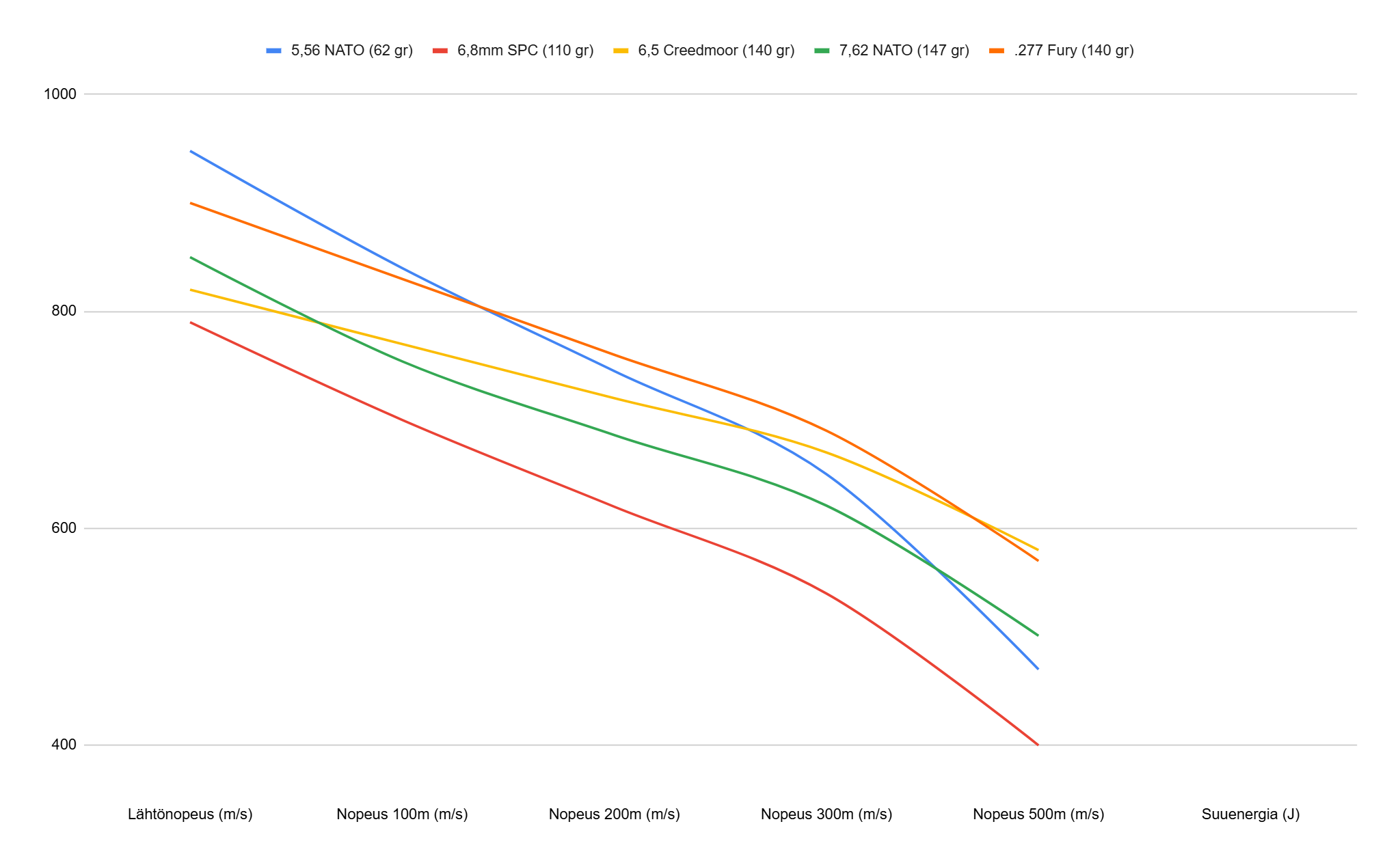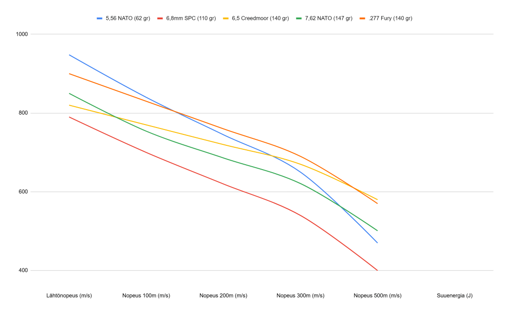 Nykyiset optiset tähtäimet tekevät, ainakin jonkinmoisella varmuudella, myös perus JV sotilaalle mahdollisuuden tuottaa tarkkaa ja osuvaa tulta aina puoleen kilometriin asti. Olen tästä syystä ottanut matka-arvioinnissa luodin nopeuden tänne asti. Kaavio alapuolella visualisoi pluodin ballistisen kertoimen vaikutuksen aseen ampumamatkaan kohtuu tehokkaasti: Vaikka 6,5mm Creedmoor (keltainen viiva) on luodeista toiseksi hitain lähdössä, on se nopein 500m päässä, se on myös energiansa puolesta tehokkain. Toki ero .227 Furyyn on pieni. Britanniassa ollaan myös vaihtamassa jalkaväen asetta, Project Grayburn, ja patruunatarkasteluun on otettu mukaan myös 6,5mm Creedmoor. Aika näyttää pysytäänkö 7,62 NATOssa, vai tuleeko uusi patruuna 6,5 NATO, joka ei ole aivan Creedmoor, mutta melkein. Tai joku muu.
