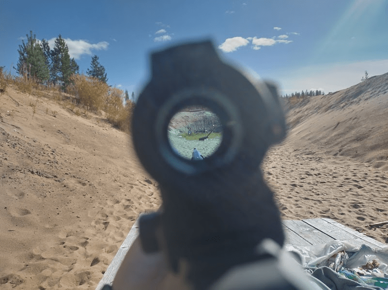 Tietävämmät kaverit varoittelivat kullanvärisestä pisteestä, koskapa heillä ja minulla ovat vihreät ja punaiset toimineet Lapin oloissa oikein hyvin. Ajattelin että, nyt olisi kuitenkin kohtuullinen paikka testata tätäkin väriä, ja koskapa kyse ei ole kriittisimmästä aseesta, niin kokeilu kannattaa tehdä sillä. Ajankohdaksi valitsin iltapäivän, jolloin kullanpunertavan valon voisi ajatella eniten häiritsevän tämän pisteen näkemistä. Tähtäyspisteenä musta piste A4 paperissa 50m etäisyydelle.