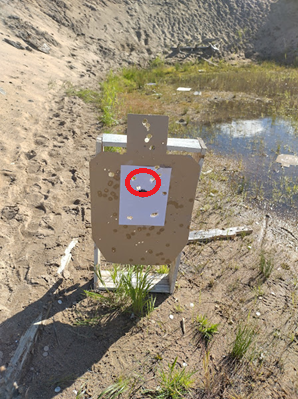 Kuten oli odotettavaa, tähtäintä sai kävelyttää aikapaljon, 35 napsua, alaspäin (Napsuväli on tässä tähtäimessä yksi kulmaminuutti) ja tähän suorituykseen menikin sitten yksi rasia täyteisiä. Ammuin aina kuitenkin kolme laukausta vähentääkseni satunnaisen poikkeaman vaikutusta suoritukseen.