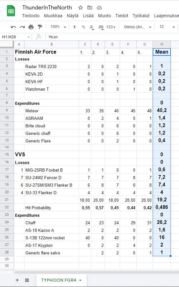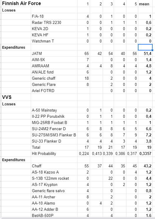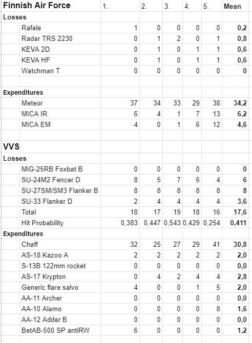 Each HX-hopefull was in the simulation 5 times plus extra time for a video (Video is not included in tabulation). All of them had significant edge over VVS (Vojenno-vozdušnyje sily Rossijskoi Federatsii), or Russian Air Force. The TO&E of VVS is generally known, so I used that. The missions the fighters are on are of course open for debate, but I’m pretty sure there would be SEAD/DEAD element and strikes against basing to “gather the eggs into fewer baskets”, ie forcing FAF into bigger concentrations to make striking against them more feasible.