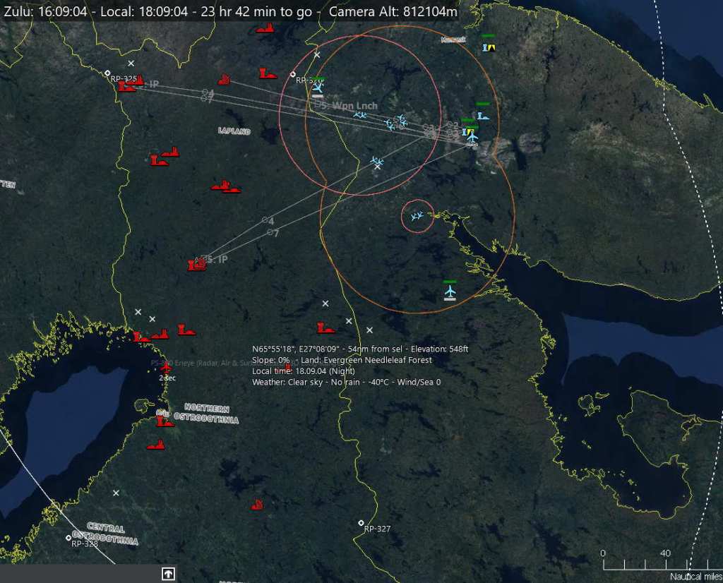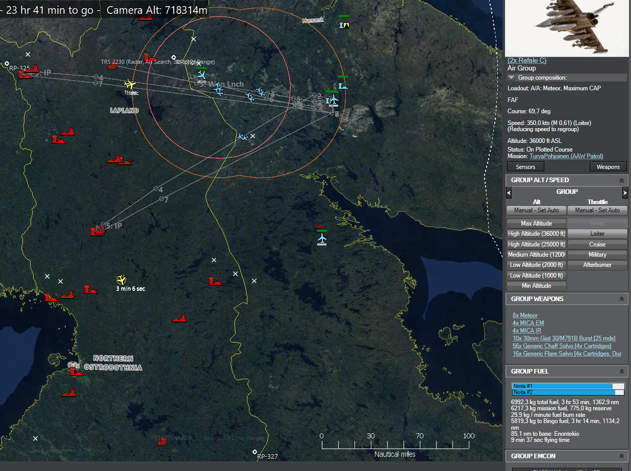 In this scenario I used F/A-18 Es with JATM missiles (Growlers were still with AMRAAM Ds). The AF-bases were the same, and again no fire untill at least four VVS fighters were in Finnish aerospace. As HX hopefulls go, F/A-18 E is in the slow side with F-35: Both can clock speeds up to 1,6 mach (This might be in some kind of load, because I have seen quotes of 1,8M clean/ in A2A nission) The European HX-hopefulls bit faster (Rafale 1,8 Mach, Gripen 2 Mach and Typhoon 2,2+ Mach). The speed is significant in two ways: It allowe you get faster where you need to be, and it helps missiles to fly a bit farther.(Height of launch is here more significant, but speed is not without impact on matter. Not to mention relative altitude between launching aircraft and the target)