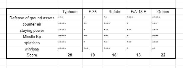Another thing is damage sustained for infrastructure. It seems to be impossible to come out of this scenario without loosing SOME radar installations. Rafale and F-35 lost 2 as a rule, Typhoon lost 1,67 and JAS-39 Gripen and F/A-18 E lost 1. There also was, more often than not strikes against airfields. (In fact ONLY Rafale lost was lost when it was taking off, but suhois dropped anti runway bombs at the same time.) So F/A-18 E and Gripen won the defensive part of the scenario. then Typhoon and Rafale and F-35 last.