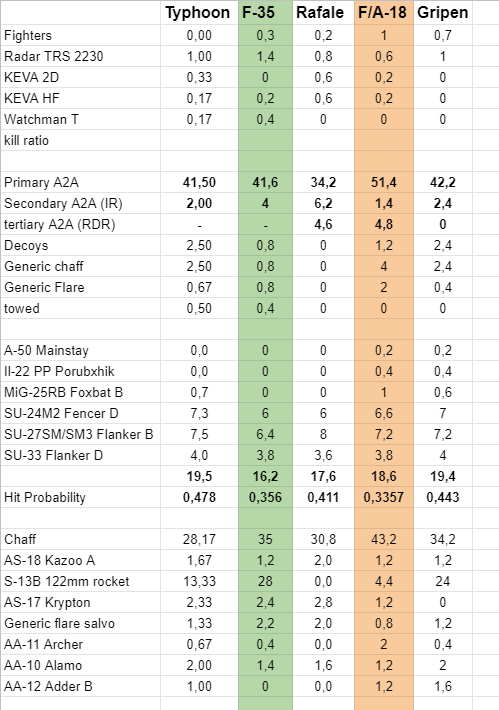 If you took the worst runs of for each this is most evident in missile Kp and lost fighters categories. For example F/A-18 E would go from average of one fighter lost in each run to 0,2 fighters lost, and JAS-39 Gripen from 0,7 to 0,3. So maybe next time I’ll make seven runs and drop off the best and the worst, to get things more even.